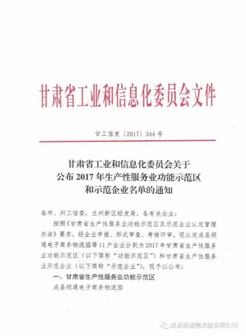 近日,國家工信部在蘭州召開了全國部分省市生產性服務業工作座談會,并啟動開展了"服務型制造萬里行·走進甘肅"系列主題活動,為2017年(第三批)省級工業設計中心、2017年省級生產性服務業功能示范區和示范企業授牌。經甘肅省工業和信息化委員會嚴格審查、考核評審,成縣順通電子商務物流園被正式確定為甘肅省生產性服務業功能示范區,并發文授牌。