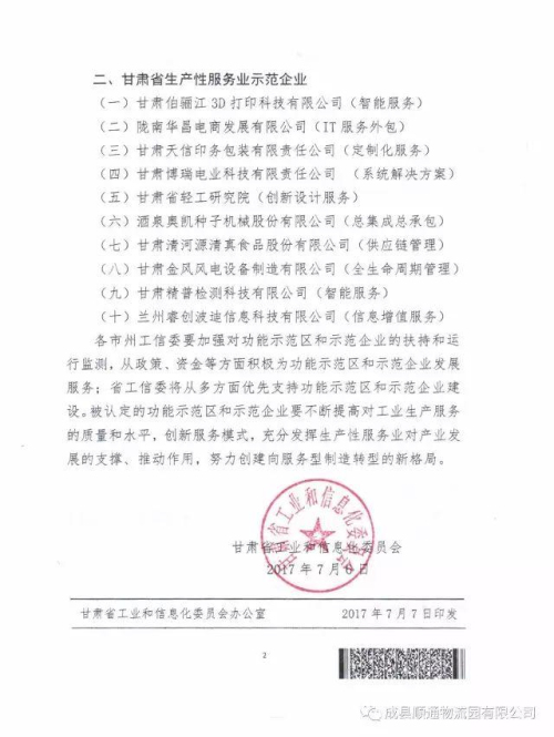 成縣順通電子商務物流園成為全省2017年唯一一家生產性服務業功能示范區,另外,省工信委還在全省授牌了10戶生產性服務業示范企業,伙伴企業隴南華昌電商發展公司作為IT外包服務典型,榮列隴南市在全省的唯一一家生產性服務業示范企業。