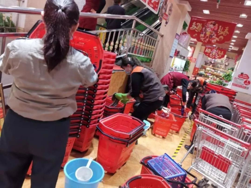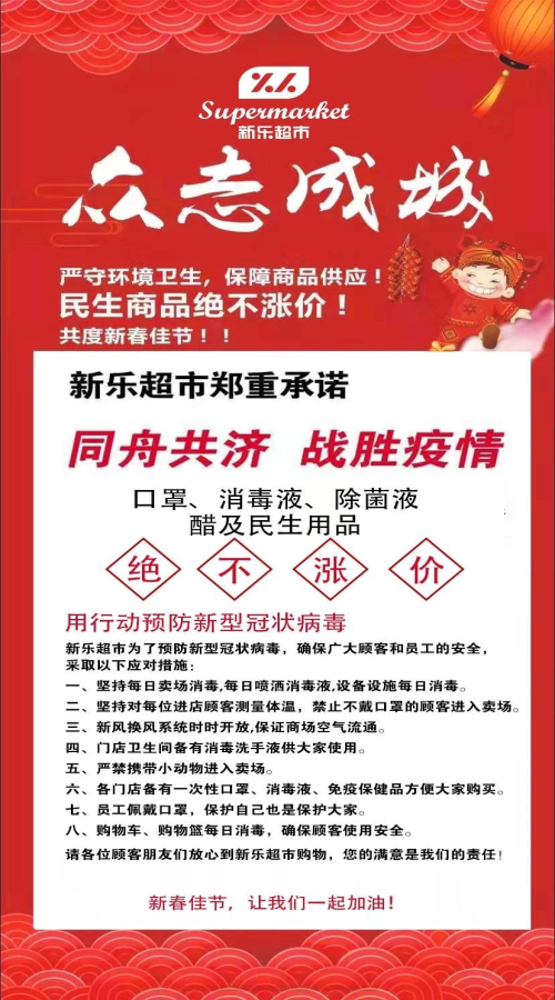 迅即行動,全面防疫。按照各級政府安排部署,新樂集團旗下超市從臘月二十八起就全面啟動應急預案,采取各項防疫防范措施。所有門店每日營業前、營業中和閉店后都會對購物車筐、電梯、地面、公共用品、設施設備等進行徹底消毒處理;所有員工配戴安全防護裝具,每日進行體溫監測和身體消毒;在各家超市醒目處張貼各類溫馨提示,普及各種防疫知識;堅持對所有進店顧客進行體溫測量,禁止不戴口罩人員進入賣場。通過系列措施,為廣大市民提供了安全、健康、放心的購物場所。