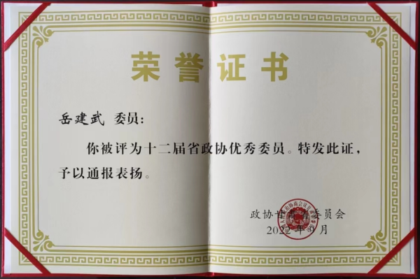 岳建武會長在擔任十二屆省政協委員期間,還曾獲得過“甘肅省優秀政協委員”(2021年)、“甘肅省非公有制經濟人士優秀中國特色社會主義事業建設者”(2017年)等榮譽稱號。
