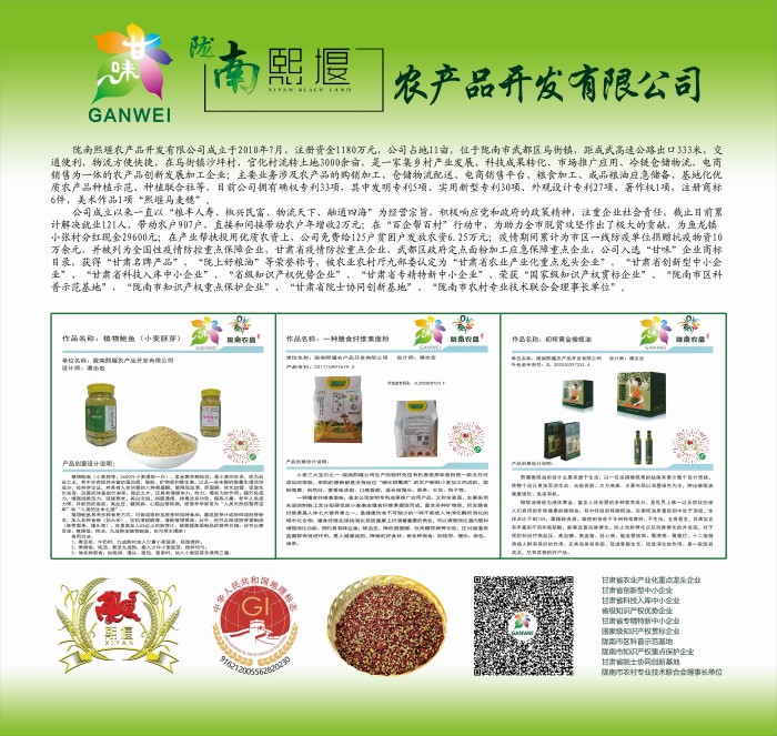 公司入選“甘味”企業商標目錄,獲得“甘肅名牌產品”“隴上好糧油”等榮譽稱號,被省農業農村廳等認定為“甘肅省農業產業化重點龍頭企業”“甘肅省創新型中小企業”“甘肅省科技入庫中小企業”“省級知識產權優勢企業”“甘肅省專精特新中小企業”,榮獲“國家級知識產權貫標企業”“隴南市區科普示范基地”“隴南市知識產權重點保護企業”“甘肅省院士協同創新基地”“隴南市農村專業技術聯合會理事長單位”。